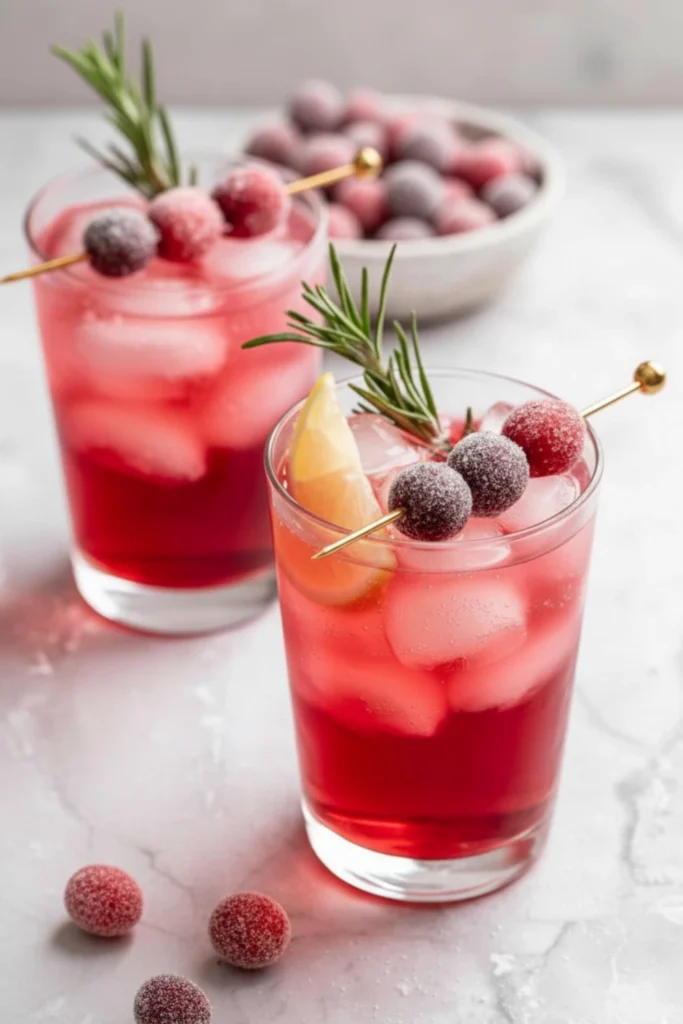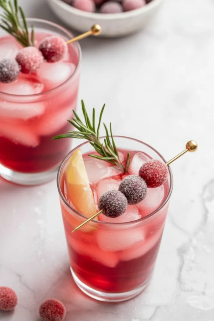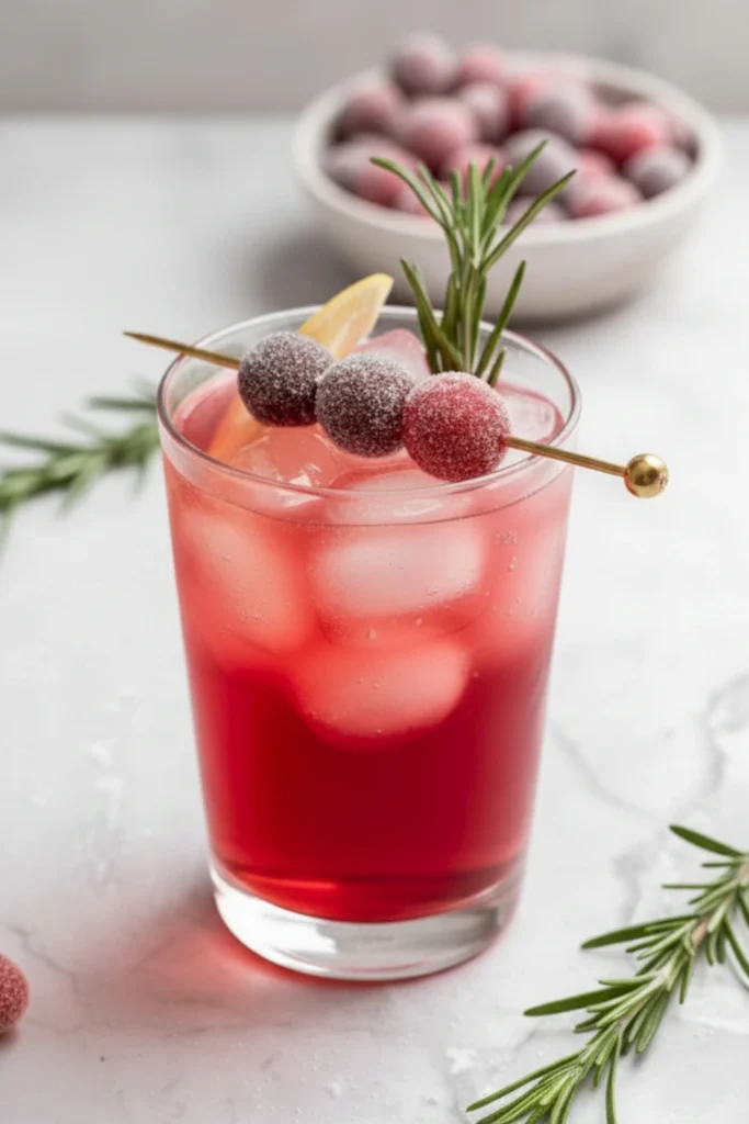 Step 5: Add Festive Garnishes. Drop in sugared cranberries, a lemon slice, and stick in a rosemary sprig. Now your drink looks like a million bucks!
